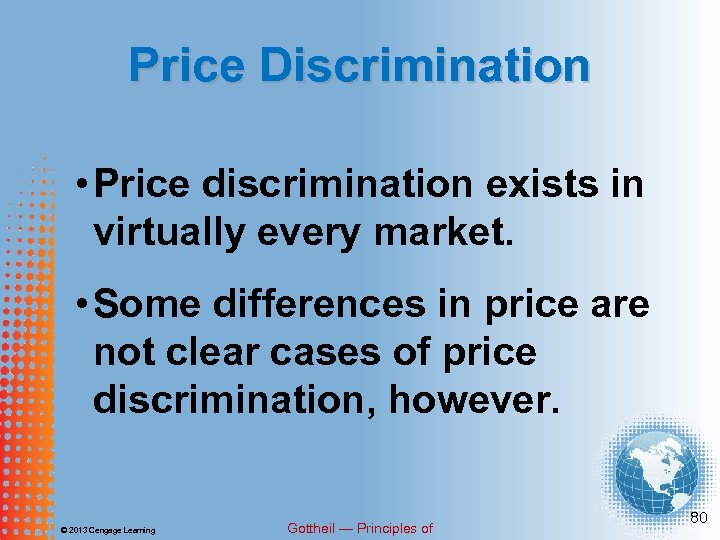 Price Discrimination • Price discrimination exists in virtually every market. • Some differences in price are not clear cases of price discrimination, however. © 2013 Cengage Learning Gottheil — Principles of 80
