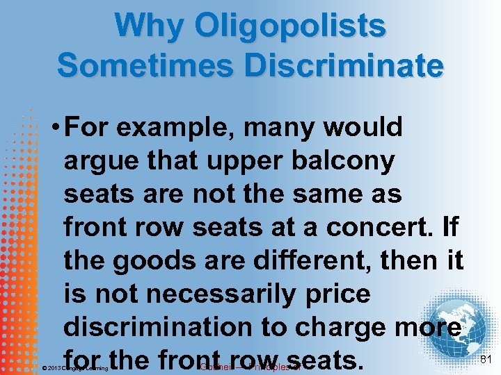 Why Oligopolists Sometimes Discriminate • For example, many would argue that upper balcony seats are not the same as front row seats at a concert. If the goods are different, then it is not necessarily price discrimination to charge more for the front row seats. © 2013 Cengage Learning Gottheil — Principles of 81