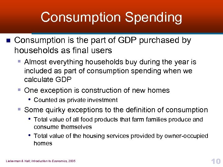 The Expenditure Approach to GDP n Everyone who purchases a good or service included in U. S. GDP must be either a § U. S. household § U. S. business or § U. S. government agency (including state and local government) § Or else is part of the foreign sector n When we add up the purchases of all four groups we get GDP • GDP = C + I + G + NX Lieberman & Hall; Introduction to Economics, 2005 9