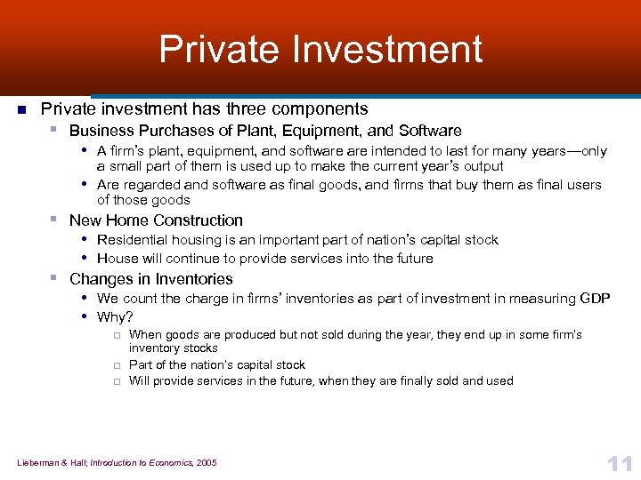 Private Investment n Private investment has three components § Business Purchases of Plant, Equipment, and Software • A firm’s plant, equipment, and software intended to last for many years—only • a small part of them is used up to make the current year’s output Are regarded and software as final goods, and firms that buy them as final users of those goods § New Home Construction • Residential housing is an important part of nation’s capital stock • House will continue to provide services into the future § Changes in Inventories • We count the charge in firms’ inventories as part of investment in measuring GDP • Why? ¨ ¨ ¨ When goods are produced but not sold during the year, they end up in some firm’s inventory stocks Part of the nation’s capital stock Will provide services in the future, when they are finally sold and used Lieberman & Hall; Introduction to Economics, 2005 11