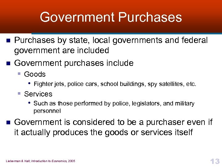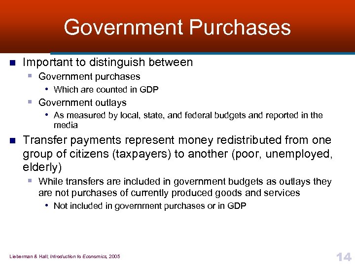 Government Purchases n n Purchases by state, local governments and federal government are included Government purchases include § Goods • Fighter jets, police cars, school buildings, spy satellites, etc. § Services • Such as those performed by police, legislators, and military personnel n Government is considered to be a purchaser even if it actually produces the goods or services itself Lieberman & Hall; Introduction to Economics, 2005 13