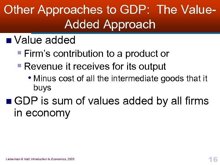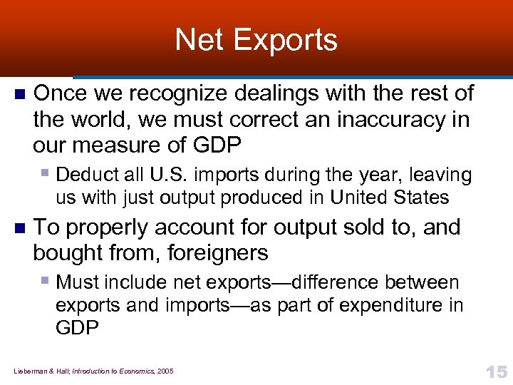 Net Exports n Once we recognize dealings with the rest of the world, we must correct an inaccuracy in our measure of GDP § Deduct all U. S. imports during the year, leaving us with just output produced in United States n To properly account for output sold to, and bought from, foreigners § Must include net exports—difference between exports and imports—as part of expenditure in GDP Lieberman & Hall; Introduction to Economics, 2005 15
