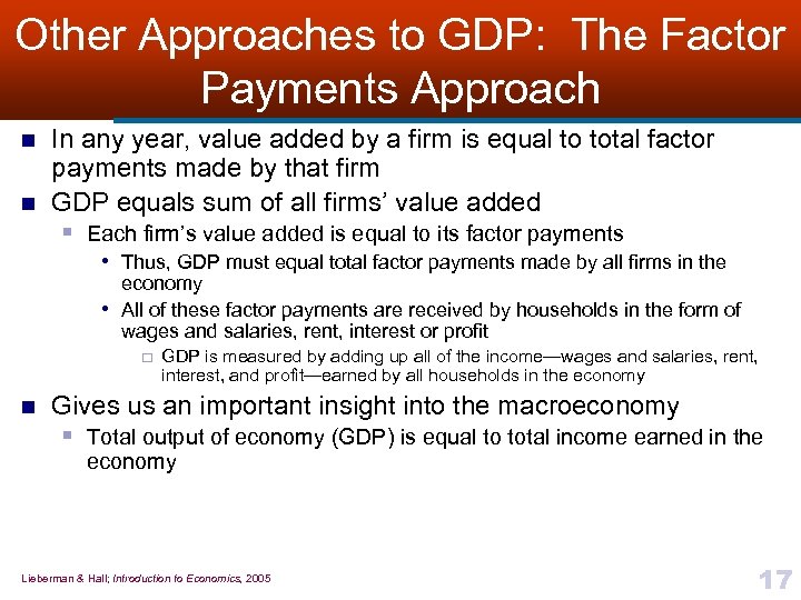Other Approaches to GDP: The Value. Added Approach n Value added § Firm’s contribution to a product or § Revenue it receives for its output • Minus cost of all the intermediate goods that it buys n GDP is sum of values added by all firms in economy Lieberman & Hall; Introduction to Economics, 2005 16
