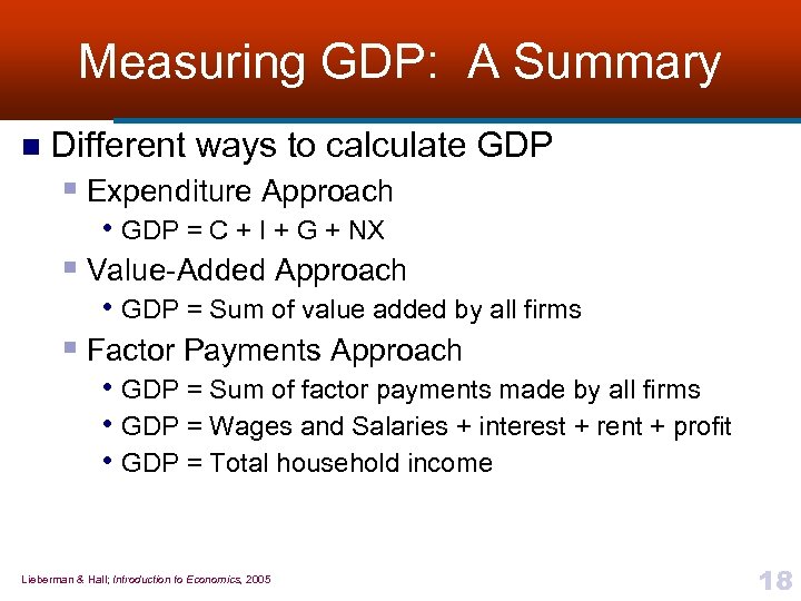 Other Approaches to GDP: The Factor Payments Approach n n In any year, value added by a firm is equal to total factor payments made by that firm GDP equals sum of all firms’ value added § Each firm’s value added is equal to its factor payments • Thus, GDP must equal total factor payments made by all firms in the • economy All of these factor payments are received by households in the form of wages and salaries, rent, interest or profit ¨ n GDP is measured by adding up all of the income—wages and salaries, rent, interest, and profit—earned by all households in the economy Gives us an important insight into the macroeconomy § Total output of economy (GDP) is equal to total income earned in the economy Lieberman & Hall; Introduction to Economics, 2005 17