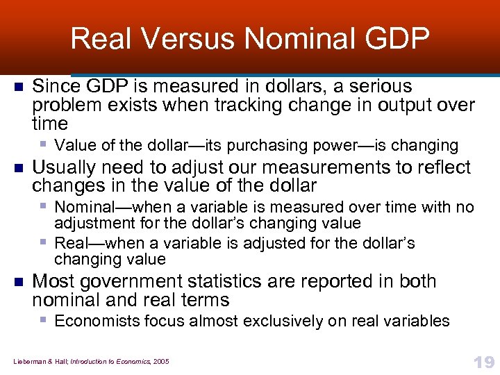 Measuring GDP: A Summary n Different ways to calculate GDP § Expenditure Approach • GDP = C + I + G + NX § Value-Added Approach • GDP = Sum of value added by all firms § Factor Payments Approach • GDP = Sum of factor payments made by all firms • GDP = Wages and Salaries + interest + rent + profit • GDP = Total household income Lieberman & Hall; Introduction to Economics, 2005 18