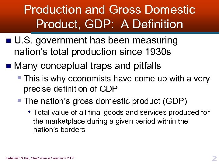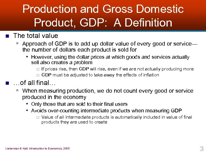Production and Gross Domestic Product, GDP: A Definition U. S. government has been measuring nation’s total production since 1930 s n Many conceptual traps and pitfalls n § This is why economists have come up with a very precise definition of GDP § The nation’s gross domestic product (GDP) • Total value of all final goods and services produced for the marketplace during a given period within the nation’s borders Lieberman & Hall; Introduction to Economics, 2005 2