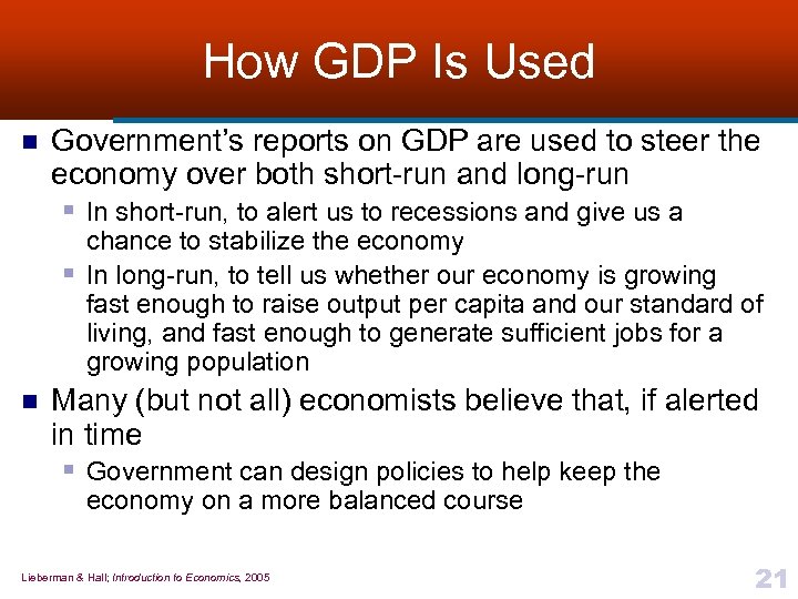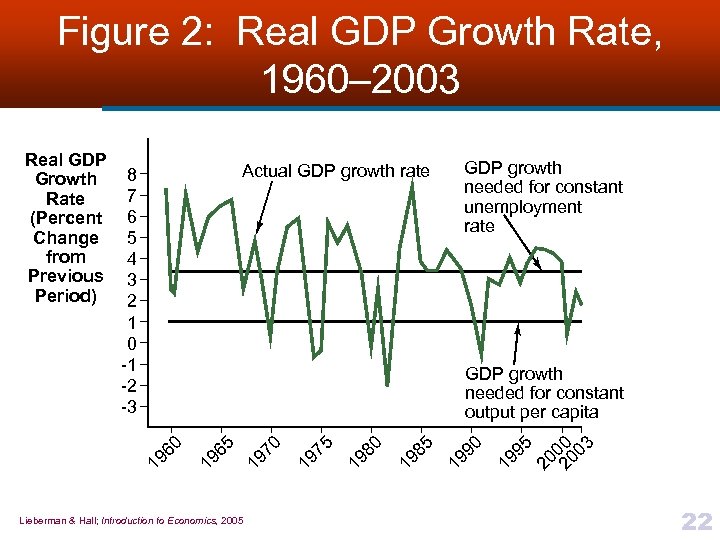 How GDP Is Used n Government’s reports on GDP are used to steer the economy over both short-run and long-run § In short-run, to alert us to recessions and give us a § n chance to stabilize the economy In long-run, to tell us whether our economy is growing fast enough to raise output per capita and our standard of living, and fast enough to generate sufficient jobs for a growing population Many (but not all) economists believe that, if alerted in time § Government can design policies to help keep the economy on a more balanced course Lieberman & Hall; Introduction to Economics, 2005 21