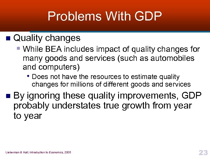 Problems With GDP n Quality changes § While BEA includes impact of quality changes for many goods and services (such as automobiles and computers) • Does not have the resources to estimate quality changes for millions of different goods and services n By ignoring these quality improvements, GDP probably understates true growth from year to year Lieberman & Hall; Introduction to Economics, 2005 23