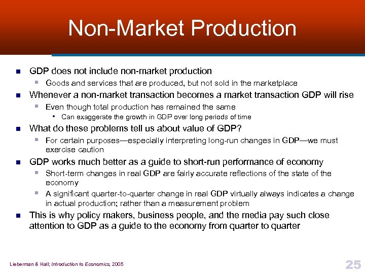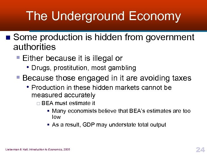 The Underground Economy n Some production is hidden from government authorities § Either because it is illegal or • Drugs, prostitution, most gambling § Because those engaged in it are avoiding taxes • Production in these hidden markets cannot be measured accurately ¨ BEA must estimate it § Many economists believe that BEA’s estimates are too low § As a result, GDP may understate total output Lieberman & Hall; Introduction to Economics, 2005 24