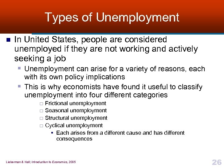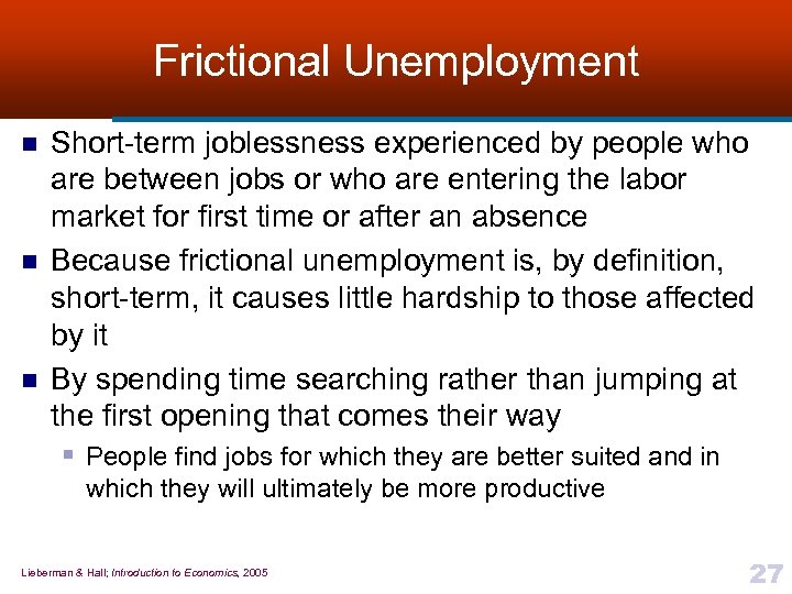 Types of Unemployment n In United States, people are considered unemployed if they are not working and actively seeking a job § Unemployment can arise for a variety of reasons, each § with its own policy implications This is why economists have found it useful to classify unemployment into four different categories ¨ ¨ Frictional unemployment Seasonal unemployment Structural unemployment Cyclical unemployment § Each arises from a different cause and has different consequences Lieberman & Hall; Introduction to Economics, 2005 26