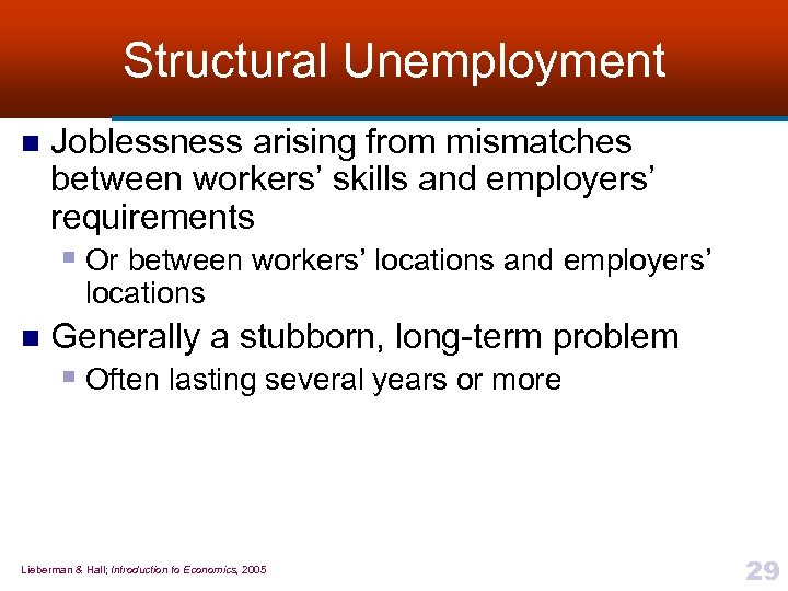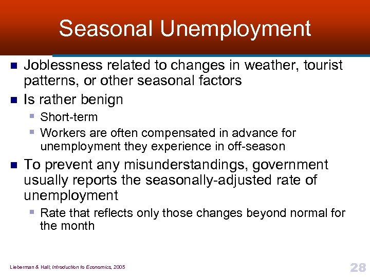 Seasonal Unemployment n n Joblessness related to changes in weather, tourist patterns, or other seasonal factors Is rather benign § Short-term § Workers are often compensated in advance for unemployment they experience in off-season n To prevent any misunderstandings, government usually reports the seasonally-adjusted rate of unemployment § Rate that reflects only those changes beyond normal for the month Lieberman & Hall; Introduction to Economics, 2005 28