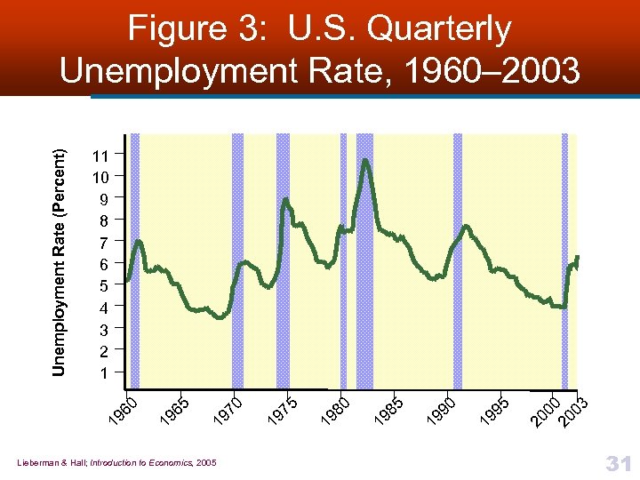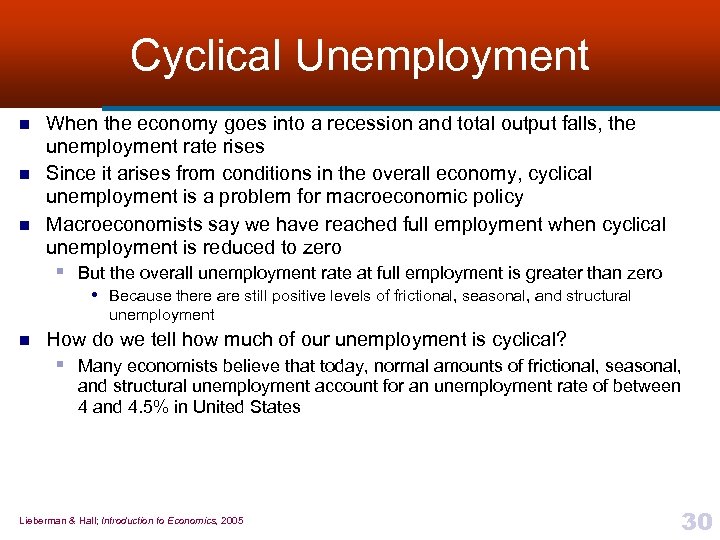 Cyclical Unemployment n n n When the economy goes into a recession and total output falls, the unemployment rate rises Since it arises from conditions in the overall economy, cyclical unemployment is a problem for macroeconomic policy Macroeconomists say we have reached full employment when cyclical unemployment is reduced to zero § But the overall unemployment rate at full employment is greater than zero • Because there are still positive levels of frictional, seasonal, and structural unemployment n How do we tell how much of our unemployment is cyclical? § Many economists believe that today, normal amounts of frictional, seasonal, and structural unemployment account for an unemployment rate of between 4 and 4. 5% in United States Lieberman & Hall; Introduction to Economics, 2005 30