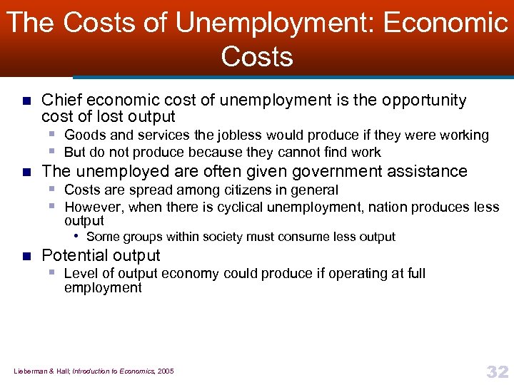 The Costs of Unemployment: Economic Costs n n Chief economic cost of unemployment is the opportunity cost of lost output § Goods and services the jobless would produce if they were working § But do not produce because they cannot find work The unemployed are often given government assistance § Costs are spread among citizens in general § However, when there is cyclical unemployment, nation produces less output • Some groups within society must consume less output n Potential output § Level of output economy could produce if operating at full employment Lieberman & Hall; Introduction to Economics, 2005 32
