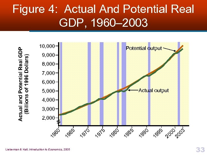 10, 000 Potential output 9, 000 8, 000 7, 000 6, 000 Actual output 5, 000 4, 000 3, 000 Lieberman & Hall; Introduction to Economics, 2005 20 00 20 03 19 95 19 90 19 85 19 80 19 75 19 70 19 65 2, 000 19 60 Actual and Potential Real GDP (Billions of 1996 Dollars) Figure 4: Actual And Potential Real GDP, 1960– 2003 33