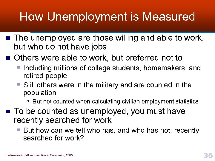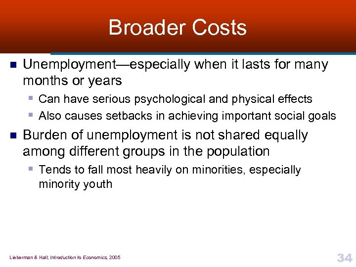 Broader Costs n n Unemployment—especially when it lasts for many months or years § Can have serious psychological and physical effects § Also causes setbacks in achieving important social goals Burden of unemployment is not shared equally among different groups in the population § Tends to fall most heavily on minorities, especially minority youth Lieberman & Hall; Introduction to Economics, 2005 34