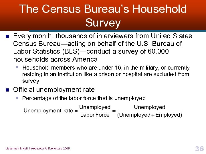 The Census Bureau’s Household Survey n Every month, thousands of interviewers from United States Census Bureau—acting on behalf of the U. S. Bureau of Labor Statistics (BLS)—conduct a survey of 60, 000 households across America § Household members who are under 16, in the military, or currently residing in an institution like a prison or hospital are excluded from survey n Official unemployment rate § Percentage of the labor force that is unemployed Lieberman & Hall; Introduction to Economics, 2005 36