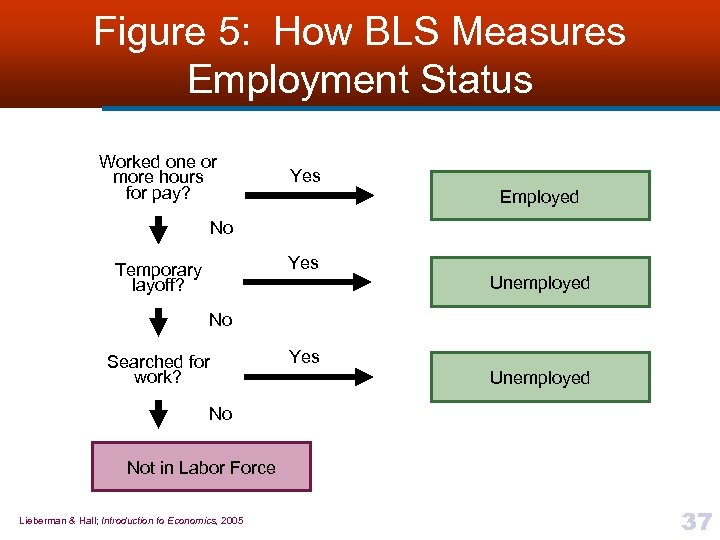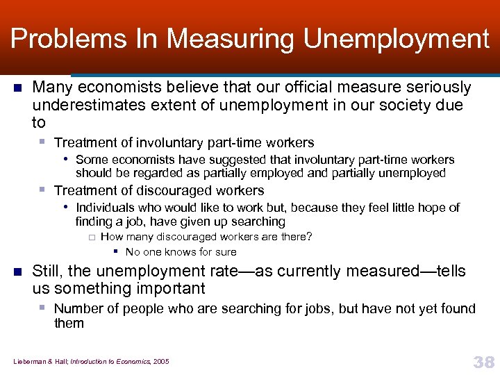 Figure 5: How BLS Measures Employment Status Worked one or more hours for pay? Yes Employed No Yes Temporary layoff? Unemployed No Searched for work? Yes Unemployed No Not in Labor Force Lieberman & Hall; Introduction to Economics, 2005 37