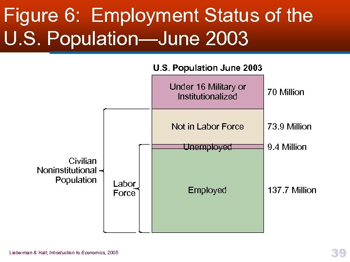 Figure 6: Employment Status of the U. S. Population—June 2003 U. S. Population June 2003 Under 16 Military or Institutionalized Not in Labor Force Lieberman & Hall; Introduction to Economics, 2005 73. 9 Million Unemployed Civilian Noninstitutional Population 70 Million 9. 4 Million Employed 137. 7 Million 39