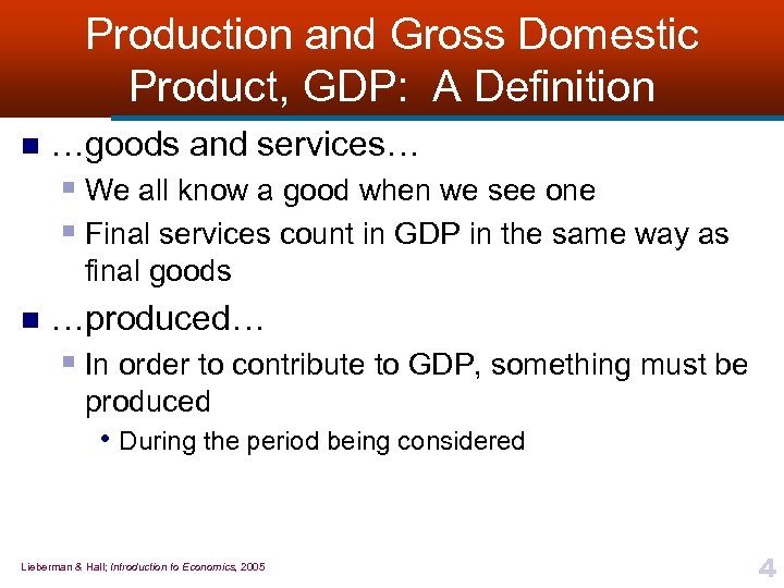 Production and Gross Domestic Product, GDP: A Definition n The total value § Approach of GDP is to add up dollar value of every good or service— the number of dollars each product is sold for • However, using the dollar prices at which goods and services actually sell also creates a problem ¨ ¨ n If prices rise, then GDP will rise, even if we are not actually producing more GDP must be adjusted to take away the effects of inflation …of all final… § When measuring production, we do not count every good or service produced in the economy • Only those that are sold to their final users • Avoids over-counting intermediate products when measuring GDP ¨ Value of all intermediate products is automatically included in value of final products they are used to create Lieberman & Hall; Introduction to Economics, 2005 3
