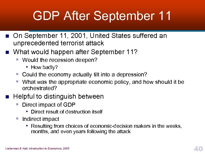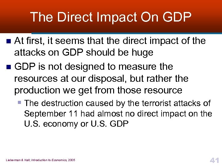 GDP After September 11 n n On September 11, 2001, United States suffered an unprecedented terrorist attack What would happen after September 11? § Would the recession deepen? • How badly? § Could the economy actually tilt into a depression? § What was the appropriate economic policy, and how should it be orchestrated? n Helpful to distinguish between § Direct impact of GDP • Direct result of destruction itself § Indirect impact • Resulting from choices of economic-decision makers in the weeks, months, and even years following the attack Lieberman & Hall; Introduction to Economics, 2005 40