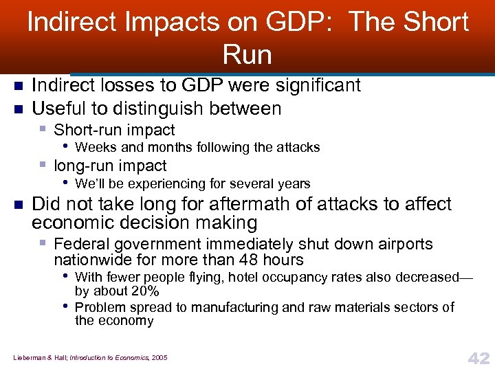The Direct Impact On GDP At first, it seems that the direct impact of the attacks on GDP should be huge n GDP is not designed to measure the resources at our disposal, but rather the production we get from those resource n § The destruction caused by the terrorist attacks of September 11 had almost no direct impact on the U. S. economy or U. S. GDP Lieberman & Hall; Introduction to Economics, 2005 41