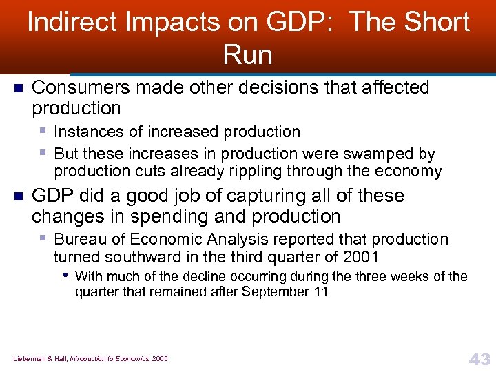 Indirect Impacts on GDP: The Short Run n n Indirect losses to GDP were significant Useful to distinguish between § Short-run impact • Weeks and months following the attacks § long-run impact • We’ll be experiencing for several years n Did not take long for aftermath of attacks to affect economic decision making § Federal government immediately shut down airports nationwide for more than 48 hours • With fewer people flying, hotel occupancy rates also decreased— • by about 20% Problem spread to manufacturing and raw materials sectors of the economy Lieberman & Hall; Introduction to Economics, 2005 42