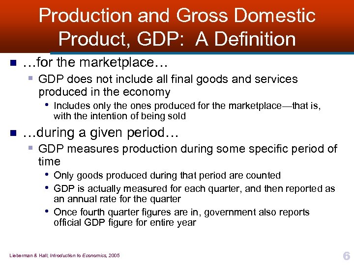 Production and Gross Domestic Product, GDP: A Definition n …for the marketplace… § GDP does not include all final goods and services produced in the economy • Includes only the ones produced for the marketplace—that is, with the intention of being sold n …during a given period… § GDP measures production during some specific period of time • Only goods produced during that period are counted • GDP is actually measured for each quarter, and then reported as • an annual rate for the quarter Once fourth quarter figures are in, government also reports official GDP figure for entire year Lieberman & Hall; Introduction to Economics, 2005 6