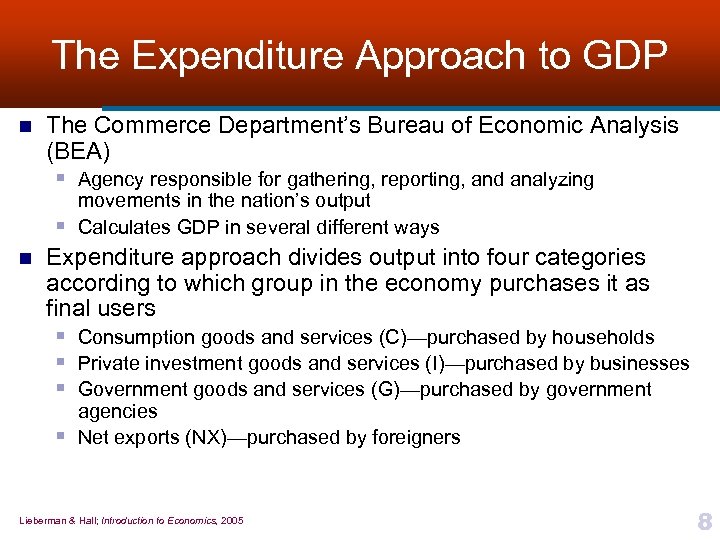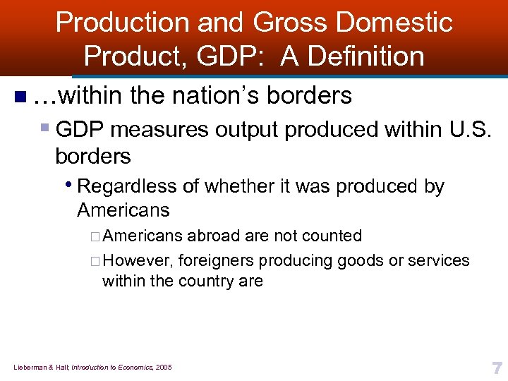 Production and Gross Domestic Product, GDP: A Definition n …within the nation’s borders § GDP measures output produced within U. S. borders • Regardless of whether it was produced by Americans ¨ Americans abroad are not counted ¨ However, foreigners producing goods or services within the country are Lieberman & Hall; Introduction to Economics, 2005 7