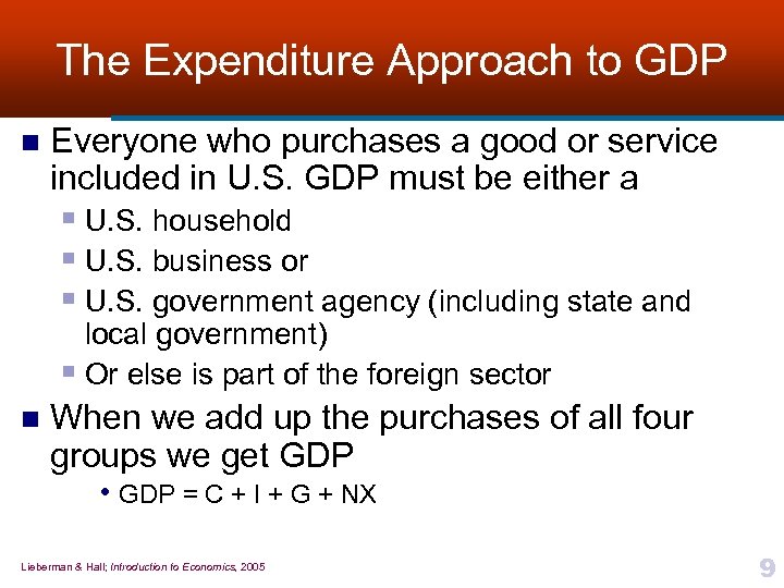 The Expenditure Approach to GDP n The Commerce Department’s Bureau of Economic Analysis (BEA) § Agency responsible for gathering, reporting, and analyzing movements in the nation’s output Calculates GDP in several different ways n § Expenditure approach divides output into four categories according to which group in the economy purchases it as final users § Consumption goods and services (C)—purchased by households § Private investment goods and services (I)—purchased by businesses § Government goods and services (G)—purchased by government § agencies Net exports (NX)—purchased by foreigners Lieberman & Hall; Introduction to Economics, 2005 8