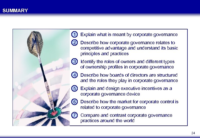 SUMMARY 1 Explain what is meant by corporate governance 2 Describe how corporate governance relates to competitive advantage and understand its basic principles and practices 3 Identify the roles of owners and different types of ownership profiles in corporate governance 4 Describe how boards of directors are structured and the roles they play in corporate governance 5 Explain and design executive incentives as a corporate governance device 6 Describe how the market for corporate control is related to corporate governance 7 Compare and contrast corporate governance practices around the world 24