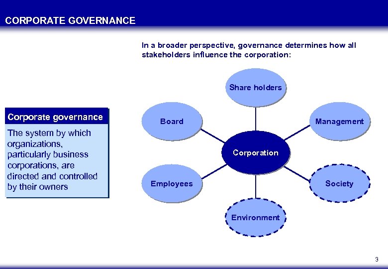 CORPORATE GOVERNANCE In a broader perspective, governance determines how all stakeholders influence the corporation: Share holders Corporate governance The system by which organizations, particularly business corporations, are directed and controlled by their owners Board Management Corporation Employees Society Environment 3