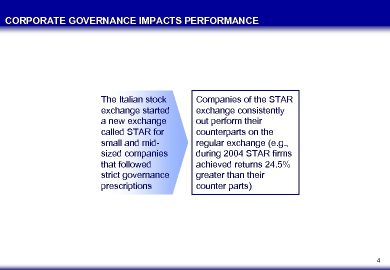 CORPORATE GOVERNANCE IMPACTS PERFORMANCE The Italian stock exchange started a new exchange called STAR for small and midsized companies that followed strict governance prescriptions Companies of the STAR exchange consistently out perform their counterparts on the regular exchange (e. g. , during 2004 STAR firms achieved returns 24. 5% greater than their counter parts) 4