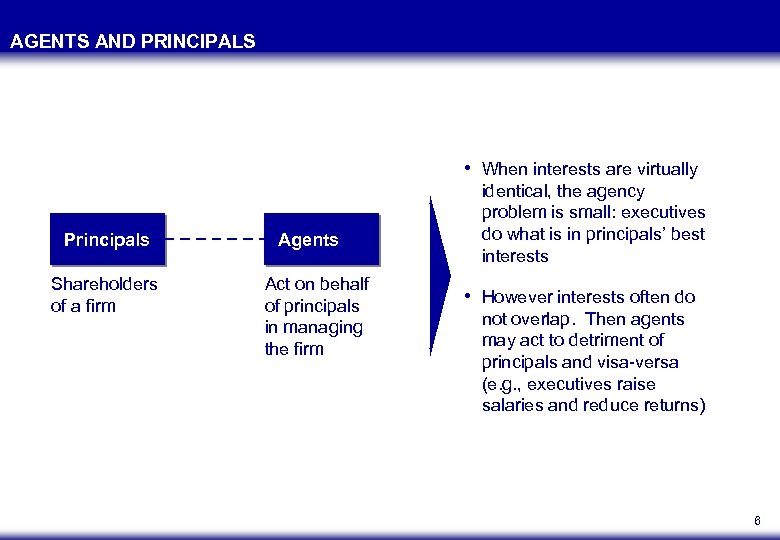 AGENTS AND PRINCIPALS • When interests are virtually Principals Shareholders of a firm Agents Act on behalf of principals in managing the firm identical, the agency problem is small: executives do what is in principals’ best interests • However interests often do not overlap. Then agents may act to detriment of principals and visa-versa (e. g. , executives raise salaries and reduce returns) 6