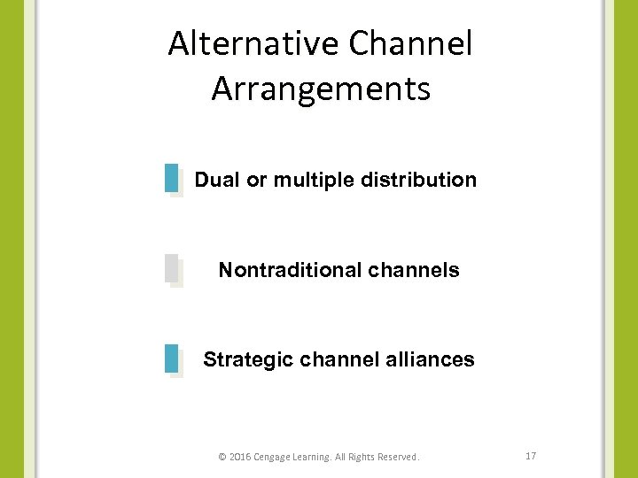 Alternative Channel Arrangements Dual or multiple distribution Nontraditional channels Strategic channel alliances © 2016 Cengage Learning. All Rights Reserved. 17