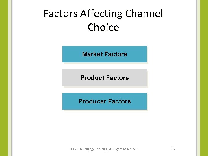 Factors Affecting Channel Choice Market Factors Producer Factors © 2016 Cengage Learning. All Rights Reserved. 18