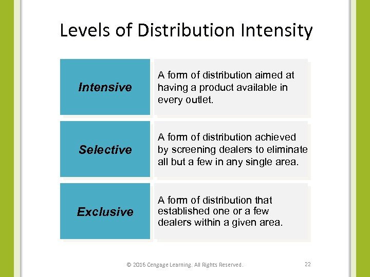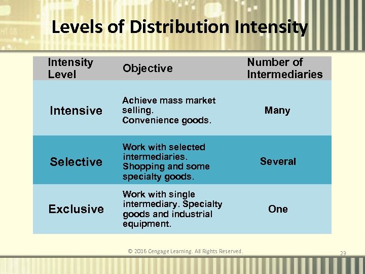 Levels of Distribution Intensity Intensive A form of distribution aimed at having a product available in every outlet. Selective A form of distribution achieved by screening dealers to eliminate all but a few in any single area. Exclusive A form of distribution that established one or a few dealers within a given area. © 2016 Cengage Learning. All Rights Reserved. 22