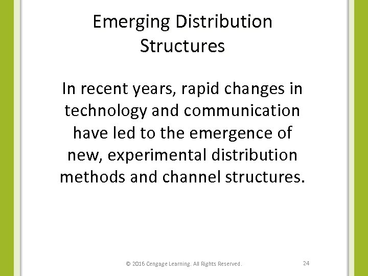 Emerging Distribution Structures In recent years, rapid changes in technology and communication have led to the emergence of new, experimental distribution methods and channel structures. © 2016 Cengage Learning. All Rights Reserved. 24