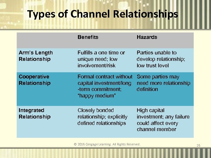 14 -3 Types of Channel Relationships Describe channel relationship types and roles, and their unique benefits and drawbacks © 2016 Cengage Learning. All Rights Reserved.
