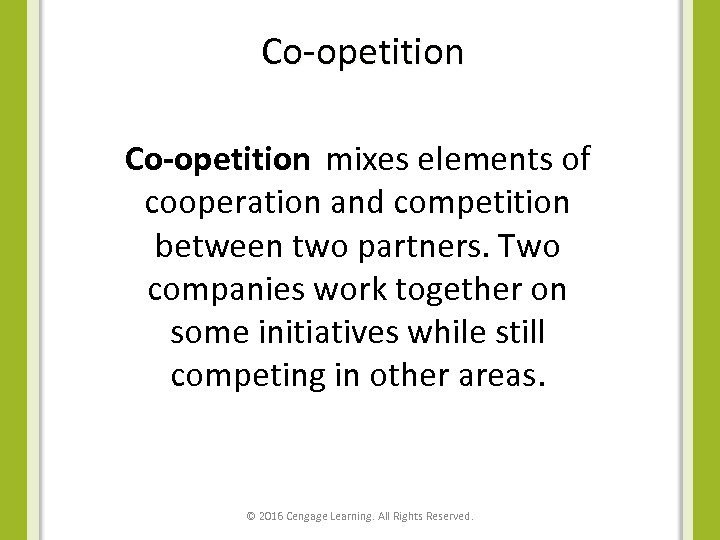Co-opetition mixes elements of cooperation and competition between two partners. Two companies work together on some initiatives while still competing in other areas. © 2016 Cengage Learning. All Rights Reserved.