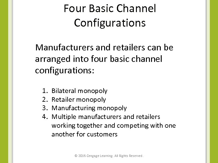 Four Basic Channel Configurations Manufacturers and retailers can be arranged into four basic channel configurations: 1. 2. 3. 4. Bilateral monopoly Retailer monopoly Manufacturing monopoly Multiple manufacturers and retailers working together and competing with one another for customers © 2016 Cengage Learning. All Rights Reserved.