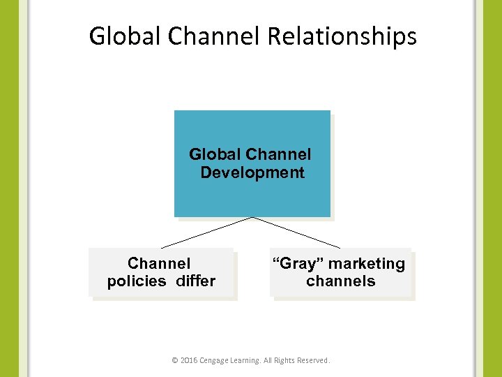 Global Channel Relationships Global Channel Development Channel policies differ “Gray” marketing channels © 2016 Cengage Learning. All Rights Reserved.
