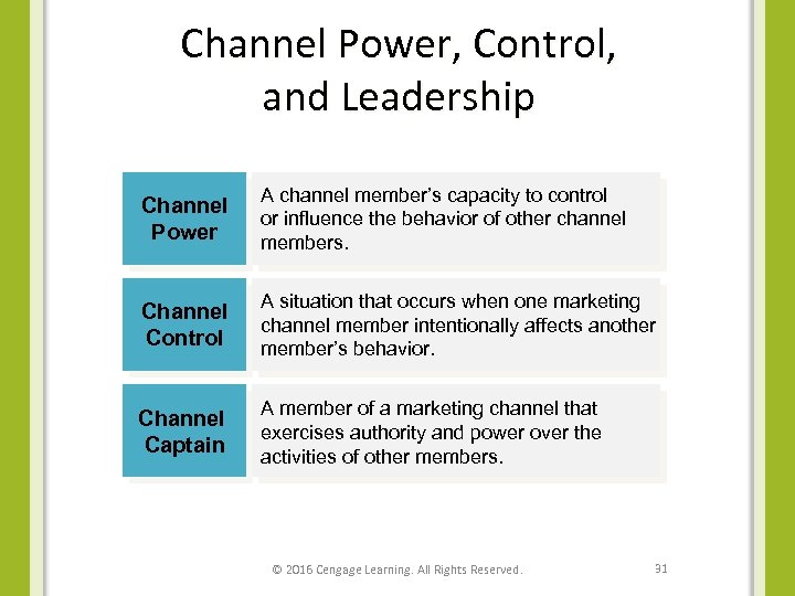 Social Influences in Channels Power Control Leadership Conflict © 2016 Cengage Learning. All Rights Reserved. 30