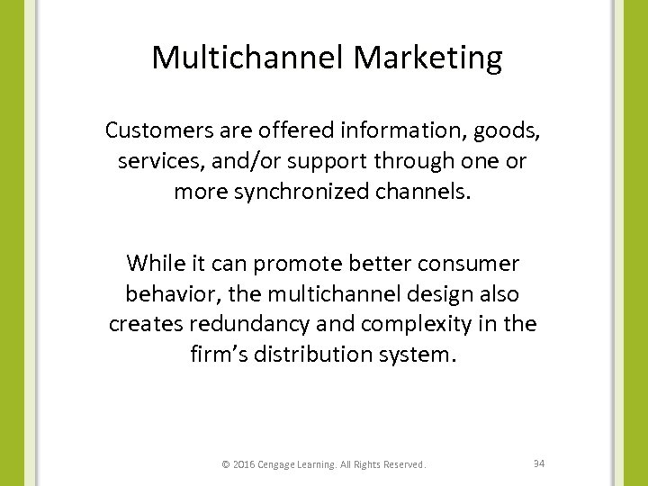 Multichannel Marketing Customers are offered information, goods, services, and/or support through one or more synchronized channels. While it can promote better consumer behavior, the multichannel design also creates redundancy and complexity in the firm’s distribution system. © 2016 Cengage Learning. All Rights Reserved. 34
