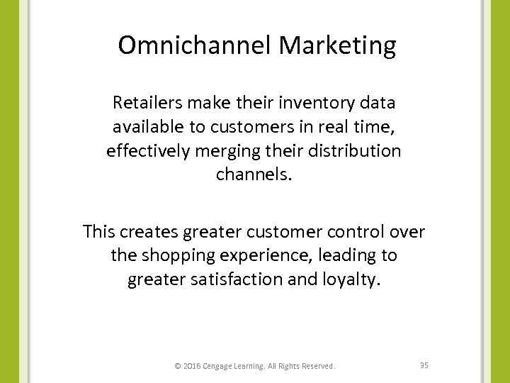 Omnichannel Marketing Retailers make their inventory data available to customers in real time, effectively merging their distribution channels. This creates greater customer control over the shopping experience, leading to greater satisfaction and loyalty. © 2016 Cengage Learning. All Rights Reserved. 35