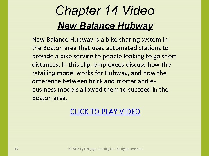 Chapter 14 Video New Balance Hubway is a bike sharing system in the Boston area that uses automated stations to provide a bike service to people looking to go short distances. In this clip, employees discuss how the retailing model works for Hubway, and how the difference between brick and mortar and ebusiness models allowed them to succeed in the Boston area. CLICK TO PLAY VIDEO 38 © 2015 by Cengage Learning Inc. All rights reserved