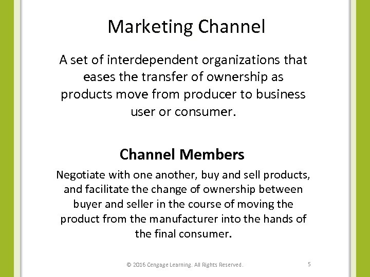 Marketing Channel A set of interdependent organizations that eases the transfer of ownership as products move from producer to business user or consumer. Channel Members Negotiate with one another, buy and sell products, and facilitate the change of ownership between buyer and seller in the course of moving the product from the manufacturer into the hands of the final consumer. © 2016 Cengage Learning. All Rights Reserved. 5
