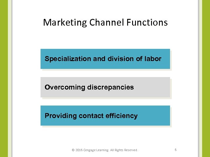 Marketing Channel Functions Specialization and division of labor Overcoming discrepancies Providing contact efficiency © 2016 Cengage Learning. All Rights Reserved. 6