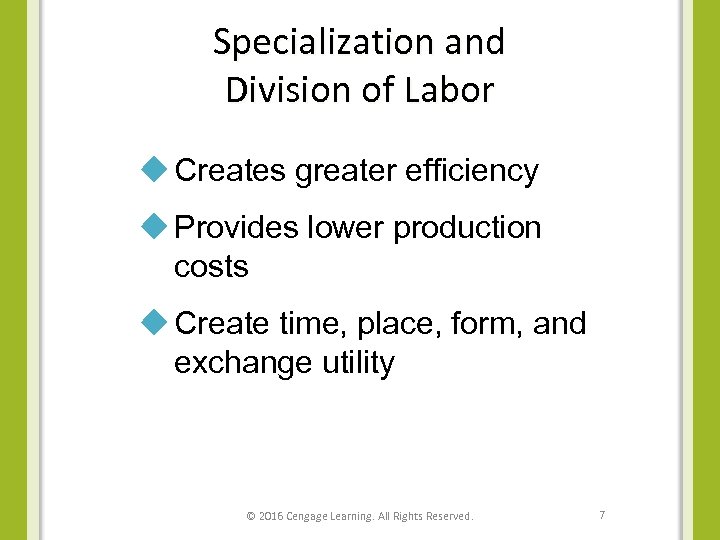 Specialization and Division of Labor u Creates greater efficiency u Provides lower production costs u Create time, place, form, and exchange utility © 2016 Cengage Learning. All Rights Reserved. 7
