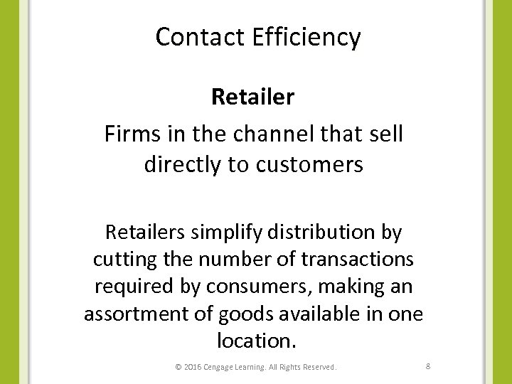 Contact Efficiency Retailer Firms in the channel that sell directly to customers Retailers simplify distribution by cutting the number of transactions required by consumers, making an assortment of goods available in one location. © 2016 Cengage Learning. All Rights Reserved. 8