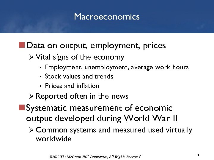 Macroeconomics n Data on output, employment, prices Ø Vital signs of the economy § Employment, unemployment, average work hours § Stock values and trends § Prices and inflation Ø Reported often in the news n Systematic measurement of economic output developed during World War II Ø Common systems and measured used virtually worldwide © 2012 The Mc. Graw-Hill Companies, All Rights Reserved 3